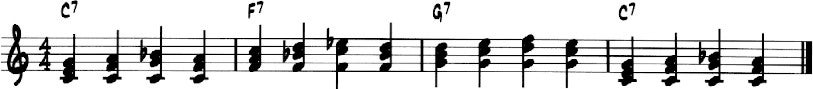 De techniek van de parallelle 7-akkoorden komt voort uit de boogie-woogie en leent zich vooral voor piano en orgel. Hieronder staat het principe in notenschrift.
