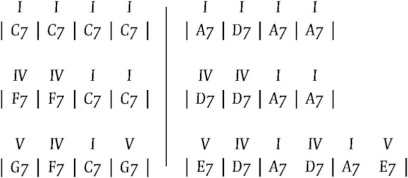 Er zijn veel blues-schema’s in omloop. In onderstaand voorbeeld zie je aan de linkerkant een veel gespeeld schema van twaalf maten (’12 bar blues’), in de toonsoort C. De Romeinse cijfers geven de trappen aan (1e trap, 4e trap, 5e trap). In een slow blues (een voorbeeld van een veel gespeelde variant zie je aan de rechterkant, in toonsoort A) wordt in een tweede maat vaak de 4e trap gespeeld, in het getoonde voorbeeld dus D7. Ook de turn-around (laatste vier maten) wordt in slow blues vaak anders gespeeld. Let op: het zijn schema’s die weliswaar heel veel gebruikt worden, maar er kan natuurlijk van worden afgeweken.