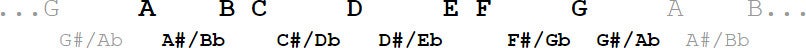 Begin met het aanslaan van de eerste snaar (de G-snaar). De tuner laat zien welke toon hij op dit moment hoort. Staat de G in beeld? Dan zit je al een heel eind goed! Maar zie je bijvoorbeeld de F of de F#/Gb? Dan moet de toon een stukje omhoog (= de snaar strakker zetten) totdat de G in beeld staat. In onderstaand rijtje kun je zien waarom: deze tonen staan iets onder de G. Staat echter de A in beeld? Dan moet de toon juist omlaag (= de snaar slapper zetten), omdat de A boven de G staat. Kortom, je draait altijd omhoog of omlaag naar de dichtstbijzijnde toon, maar – zoals gezegd – let erop dat de snaar niet heel slap of heel strak gaat staan, want dan ga je waarschijnlijk de verkeerde kant op.