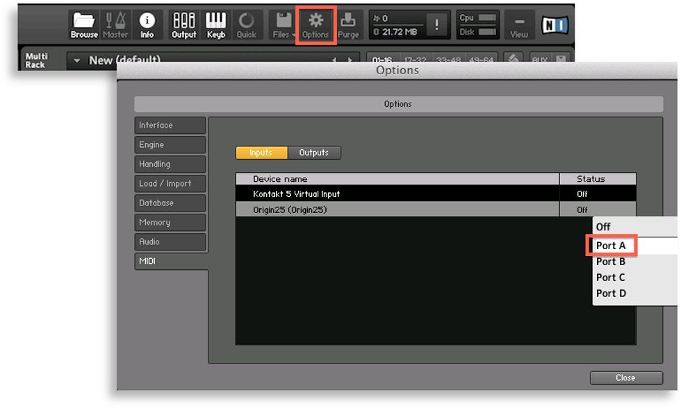 - Stel onder Options het MIDI-keyboard in op Port A. Dit doe je in principe eenmalig.