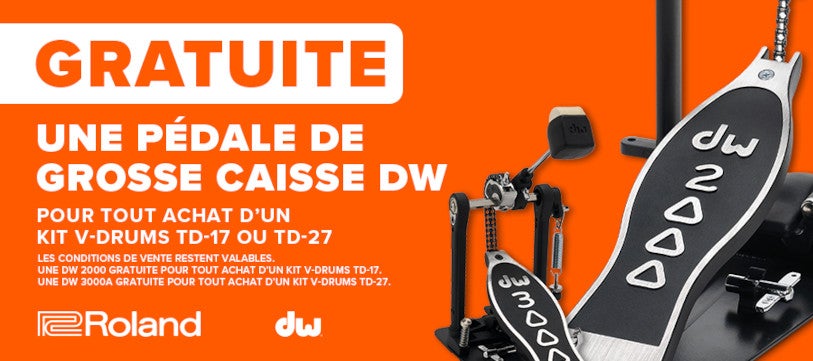 Les pédales de grosse caisse DW sont connues depuis des décennies comme étant les Cadillacs des pédales de grosse caisse. La souplesse et la réactivité des pédales DW 2000 et DW 3000a sont indéniables. Si vous achetez une batterie électronique Roland V-Drums entre le 13 septembre et le 31 mars 2025, une pédale DW vous sera offerte. En achetant un kit Roland TD-17KV2 ou un kit TD-17KVX2, vous obtiendrez une pédale DW 2000. Si vous optez pour un kit Roland TD-27KV2, vous obtiendrez alors une pédale DW 3000a. N'attendez pas trop longtemps car cette offre est valable jusqu'à épuisement des stocks.