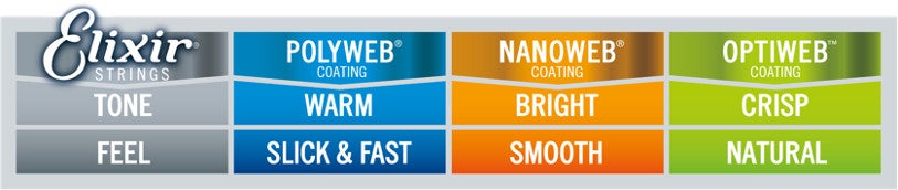 Les cordes pour guitare de Elixir sont connues pour leur longue durée de vie, ceci grâce à un revêtement spécial qui les protège contre la saleté et la corrosion. Nous avons ajouté beaucoup de nouveaux jeux de cordes Elixir à notre gamme, dont des cordes pour guitares à 7 et à 8 cordes. Pour savoir quelle est la différence entre les revêtements Polyweb, Nanoweb et Optiweb, consultez le tableau ci-dessus.
