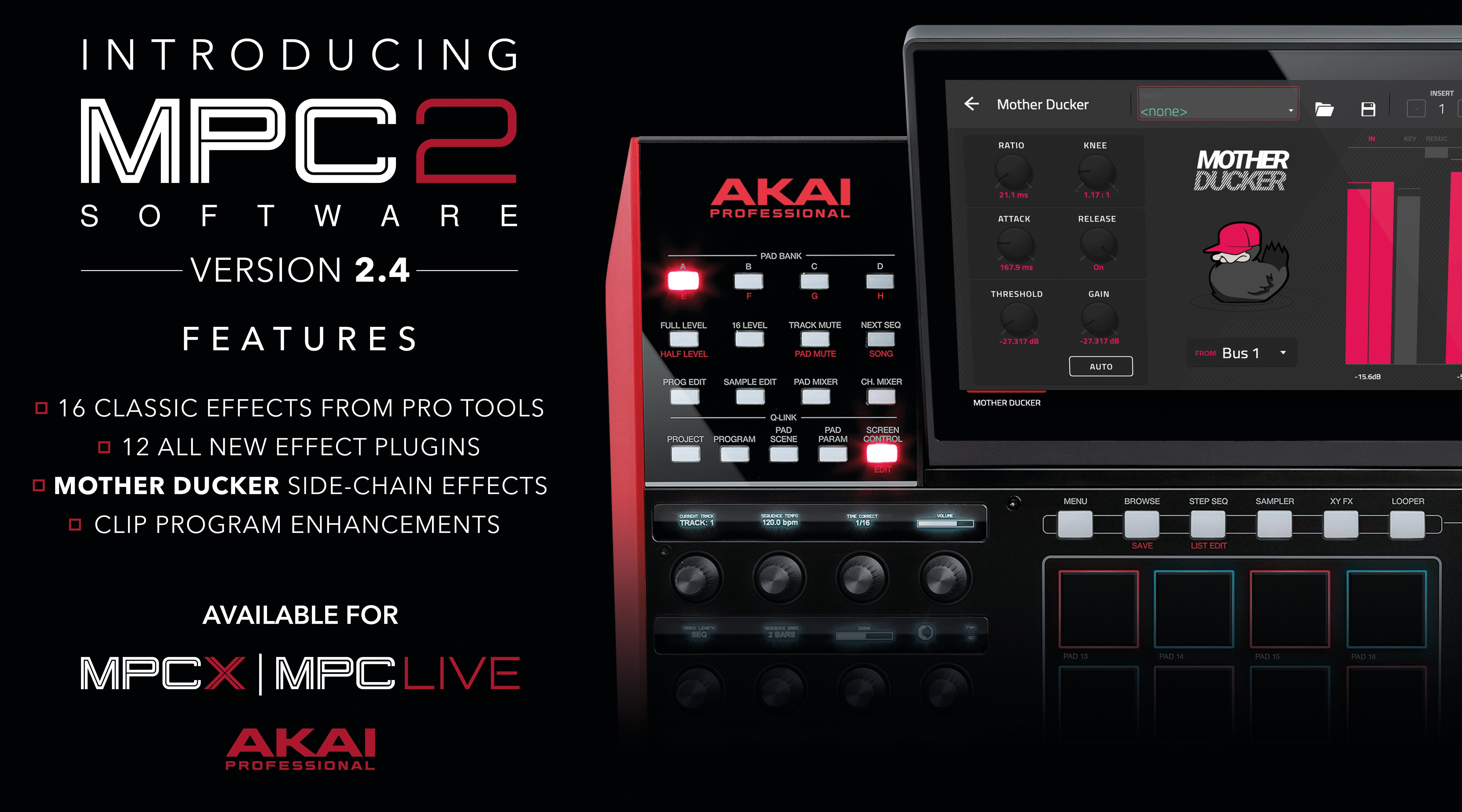 AKAI MPC 2.4: een flinke verbetering!Naast een reeks andere producten heeft AKAI zojuist de MPC 2.4 aangekondigd. En het is precies waarop MPC-gebruikers gewacht hebben. Vol workflowverbeteringen en nieuwe door jullie zo graag geziene functies. Met name de toevoeging van maar liefst 28 ‘must-have’ effecten van DSP legendes AIR Music Technology doet menig hart sneller kloppen. Maar, de grootste toevoeging is toch wel de befaamde side-chain compressor: ‘the Mother Ducker’. Deze AIR effecten zijn tevens onderdeel van Pro Tools en worden gezien als één van de meest gewaardeerde referentiesuites met FX. Dat ze naar de MPC zijn gekomen komt dus als een geschenk uit de hemel. Daarnaast is het vooral de nieuwe TUI-layouts die het gebruik van MPC 2.4 naar geheel ander niveau tillen. Vakkundig ontworpen, een legio aan effecten en met gebruiksgemak in het achterhoofd, dat is waar MPC 2.4 voor staat! Nog veel meer nieuws vind je op onze NAMM 2019 pagina! Gerelateerde merkenGerelateerde producten |