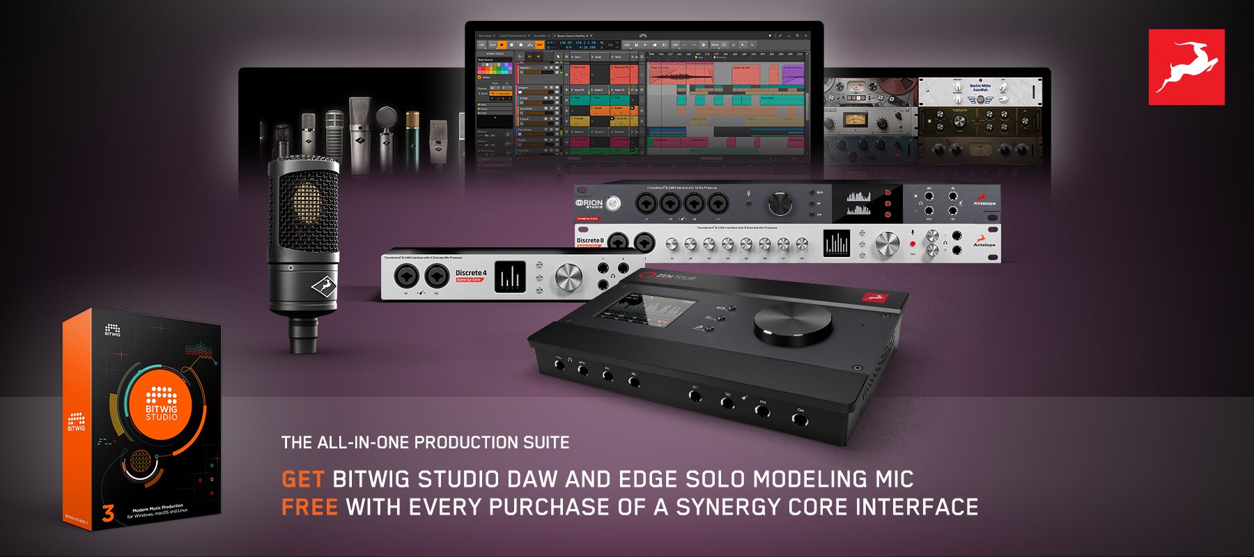 Antelope Audio maakt het de serieuzere 'recording artist' wel heel gemakkelijk nu om de overstap te wagen naar een high-end audio interface. Wanneer je tussen 1 juni en 31 juli namelijk een audio interface uit de Synergy Core-serie kiest, ontvang je naast een Edge Solo modelling-microfoon ook nog de populaire BitWig Studio DAW software geheel gratis! Lees hieronder meer.