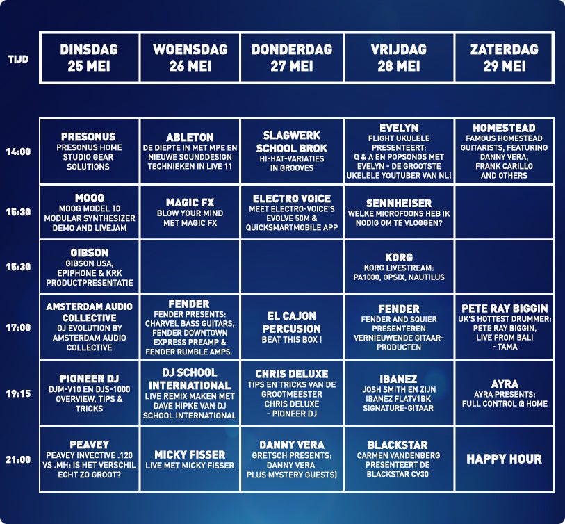 21:00 | Live met Micky Fisser | Youtube Drummer Micky Fisser kreeg het vak van bandleider met de paplepel ingegoten door zijn vader Marcel en gaat sinds 2015 zijn eigen weg. Hij begeleidt met zijn jongens onder anderen Dries Roelvink en André Hazes. Als drummer is hij het metrum van de live-show. - DONDERDAG 27 MEI -14:00 | Hi-hat-variaties in grooves | Youtube In deze livestream wordt door Marco Brok ingegaan op hoe je een basisgroove kan upgraden door veranderingen in het hi-hat-patroon aan te brengen, aangevuld met bijpassende fills.