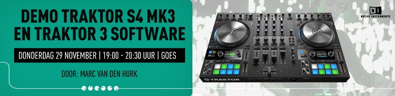 De Traktor Kontrol S4 MK3 is de nieuwste uitbreiding van Native Instruments in zijn lijn van DJ controllers. De opvolger van de populaire MK2 is niet zomaar een vierkanaals, vier decks apparaat, maar is uitgerust met de gloednieuwe Traktor 3 Pro software en het geheimzinnige Haptic Drive. Om je te laten zien wat hij allemaal kan, organiseren we op donderdagavond 29 november 2018 bij Bax Music Goes een demo waarbij productspecialist Marc van den Hurk je meeneemt door de vele functies.