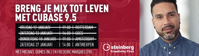 Cubase Pro 9.5 is uit, dus dat is het perfecte moment voor Steinberg-productspecialisten Michael Gomes (NL) en Frederic Marques (FR) om door de Benelux te toeren en jou te laten zien hoe je het beste uit Cubase Pro haalt. In januari 2018 kun je een gratis workshop volgen in een Bax Music vestiging naar keuze!