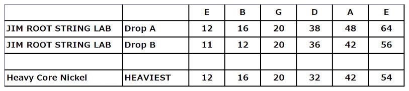 In onderstaande tabel vergelijken we de Jim Root snarensets met de dikste set uit de Heavy Core Nickel-serie. Je zult zien dat Root heeft gekozen voor extra dikke lage snaren voor beide sets. Het resultaat is dat je tijdens het spelen van snelle riffs en complexe melodieën kunt rekenen op een stabiele en strakke feel, wat natuurlijk een absolute must is wanneer je een energieke performance geeft. Uiteraard is deze set ook zeker de moeite waard wanneer je geen fan bent van Slipknot, maar toch graag in een lage stemming speelt op je 6-snarige elektrische gitaar.