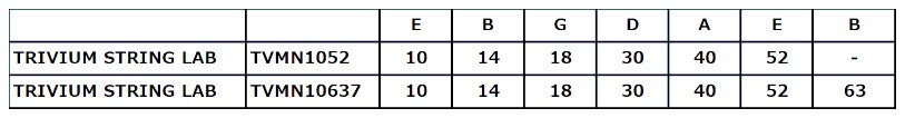 Matt Heafy en Corey Beaulieu gebruiken als sinds de start van Trivium de snaren van Dunlop. Hun signature-sets hebben dan ook exact dezelfde snaren en diktes die zij altijd gebruiken. Deze snaren zijn gebaseerd op de Heavy Core-serie en bieden levendige hoge tonen en rijke lage tonen. Dit maakt deze sets uitermate geschikt voor zowel het betere riff-werk als in your face leads. De Trivium String Lab snarenset is er in 6-snarige én 7-snarige variant.
