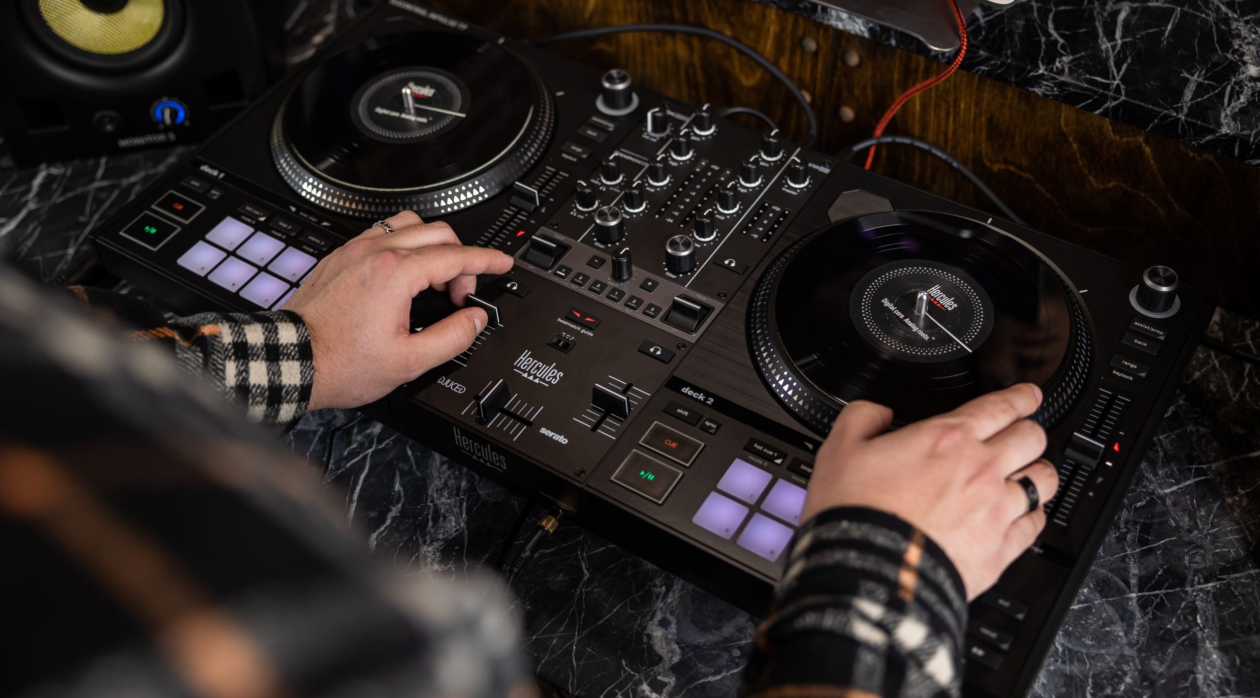 T7: Turn It UpHercules staat al lang bekend om zijn degelijke, voordelige DJ-controllers voor beginnende DJ's die willen leren mixen. Hun meest populaire DJ-controllers dit jaar zijn dan ook de Inpulse 200 en de Inpulse 500, twee controllers die onder de 300,- euro kosten die je nét dat beetje extra functionaliteit en een meer professionele look and feel geven zodat je je als een serieuze DJ kan voelen. En enkele maanden geleden introduceerde Hercules de Inpulse T7, een DJ-controller van nog geen 700,- euro die met kop en schouders boven de rest van Hercules' assortiment uitsteekt. Wat heeft deze DJ-controller die de andere Inpulse-controllers niet hebben? Authentiek vinylLaten we beginnen bij de gemotoriseerde platters met een standaardgrootte van 7 inch. In een tiende van een seconde draaien de platters van 0 RPM naar 33 1/3 RPM en kan je dus razendsnel van start gaan. Ze hebben tops van authentiek vinyl, maar je kan ook de stoffen slipmats of het vinyl scheiden van de metalen platters. Zo mix, beatmatch en scratch je met de platters op de manier die jij het prettigst vindt. Ook is de DJControl Inpulse T7 compatibel met Serato DJ Stems Control die je met één knop kan activeren; een voorrecht die merken zoals Denon DJ en RANE bewaren voor hun controllers die minstens twee keer zo duur zijn. Professionele aansluitingen en beatmatchingVerder is de Hercules DJControl Inpulse uitgevoerd met hetzelfde bekroonde Beatmatch Guide-systeem als de andere Inpulse-controllers om je te helpen met het matchen van de snelheid tussen tracks. Je kan op de T7 effecten toevoegen met knoppen en schakelaars, en je hebt een tal van professionele aansluitingen. Met zowel XLR-outputs als RCA-outputs, twee koptelefoon-outputs en een microfoon-input heeft de T7 een serieuze aanwezigheid in kleine zaaltjes. Verder is de crossfader curve in te stellen en kan je de controller op pootjes zetten om te voorkomen dat 'ie verzuipt bij een ongelukkig, omgestoot biertje. Voor wie net iets meer te besteden heeft en aan de slag wilt gaan met een professionelere DJ-controller onder de 1000,- euro is de Hercules DJControl Inpulse T7 een absolute aanrader!