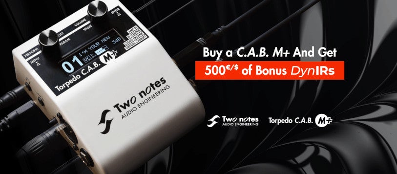 Two notes pakt uit met een ongekende actie. Bij aankoop van een Two Notes Torpedo C.A.B. M+ tijdens de actieperiode krijg je namelijk €500 aan DynIR virtuele speakerkasten erbij! |