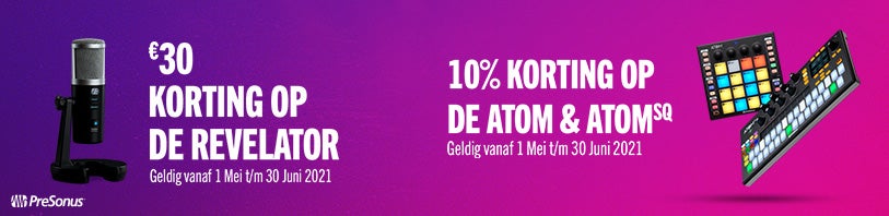 De actieDrie producten dus; een cashback houdt dus in dat je geld terugkrijgt als je een van die producten aankoopt. In de kern kun je dat dus domweg zien als korting. Dit is echter een korting die je dus wel zelf even moet claimen bij Presonus zelf. Bax Music is louter het doorgeefluik van de informatie omtrent deze actie. Welke producten doen er mee?Een goede USB-microfoon is voor velen een uitkomst, een voordelige manier om zonder poespas een opname van studiokwaliteit te maken. En zo doet de Presonus Revelator dus mee aan deze actie. Hier krijg je Studio One Artist bij, en je krijgt €30 cashback! Dan de Presonus Atom, dit is een veelzijdige pad-controller, wederom inclusief Studio One Artist (€15 cashback). Maar dan mag de Atom SQ ook niet ontbreken, en gelukkig staat deze ook in de lijst. Het is een zeer complete DAW-controller met pads, pad-stijl klavier, encoders, transportbuttons en meer. Raad eens welke DAW je erbij krijgt! Inderdaad, én Ableton Live Lite. Voor de Atom SQ krijg je €25 cashback. Gerelateerde merkenGerelateerde producten |